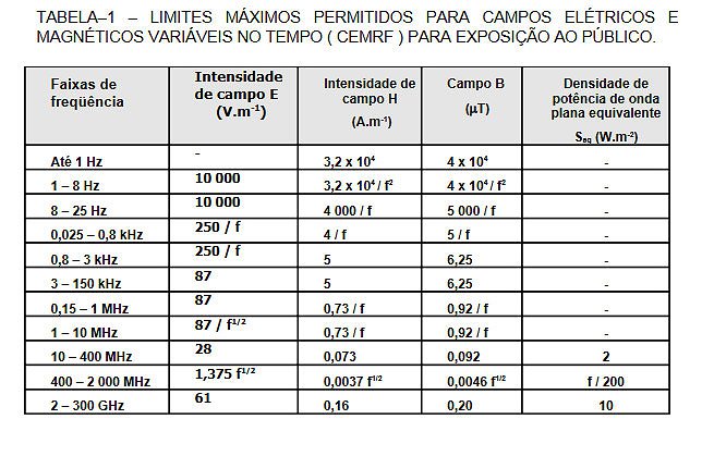 DOS LIMITES MÁXIMOS DE RADIAÇÕES / POTÊNCIA PERMITIDOS PARA OS CAMPOS ELÉTRICOS, MAGNÉTICOS E ELETROMÁGNÉTICOS VARIÁVEIS NO TEMPO DE RADIOFREQUÊNCIA - CEMRF