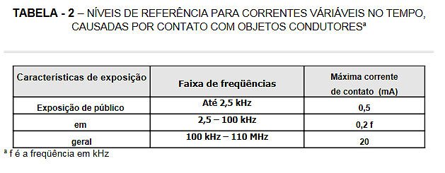 NOTA: Ver ANEXO I – os gráficos dos níveis de referência para exposição acampos elétricos e magnéticos variáveis no tempo - CEMRF, referentes a tabela 1 § 1º NÍVEIS DE REFERÊNCIA PARACORRENTES DE CONTATO E INDUZIDAS - Até 110 MHz, o que inclui a faixa de freqüências de transmissão de rádio FM, sãodados níveis de referência para correntes de contato, acima dos quais deve-se ter ocuidado de evitar riscos de choques e queimaduras. Os níveis de referência para acorrente no ponto de contato são apresentados na Tabela-2