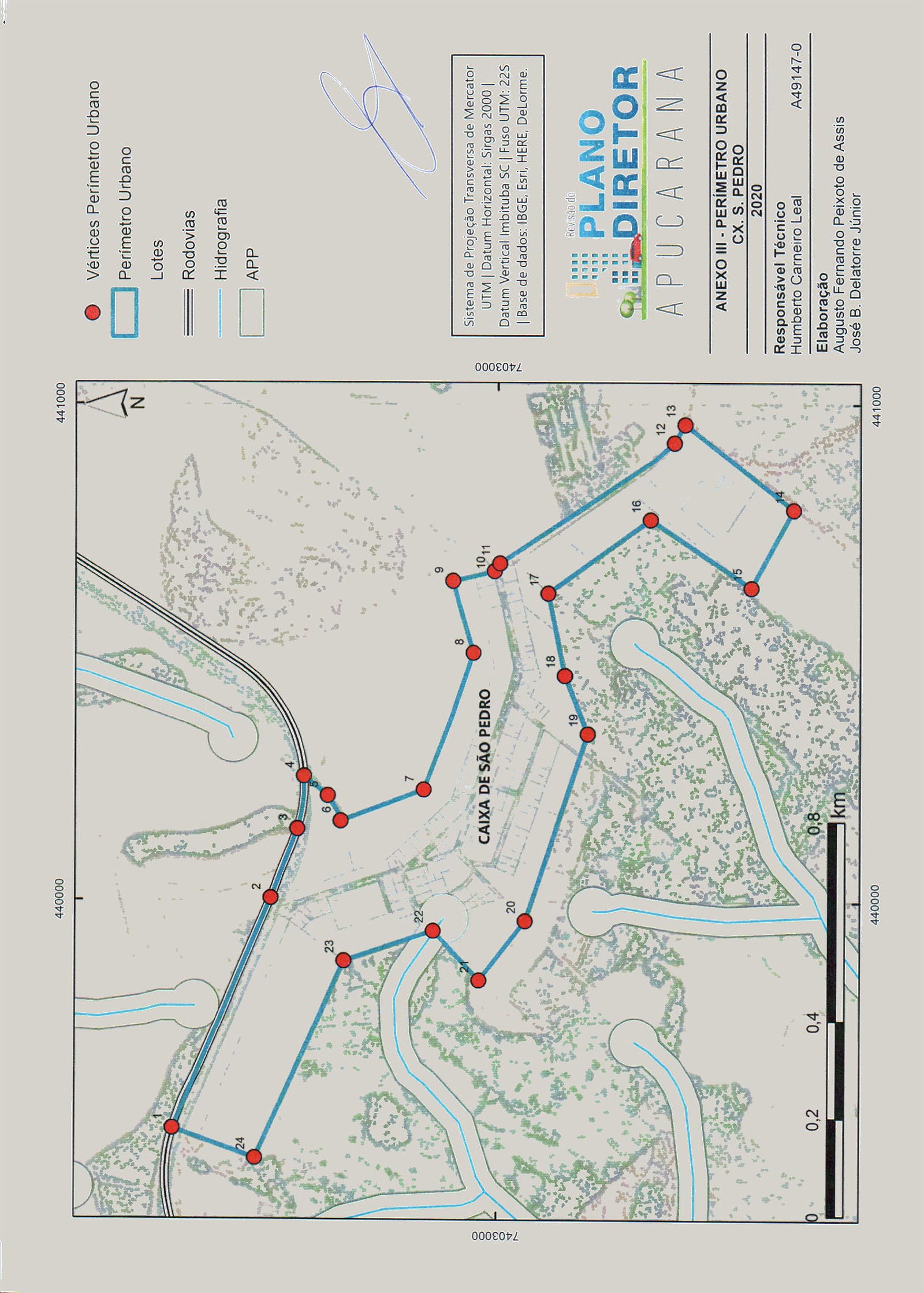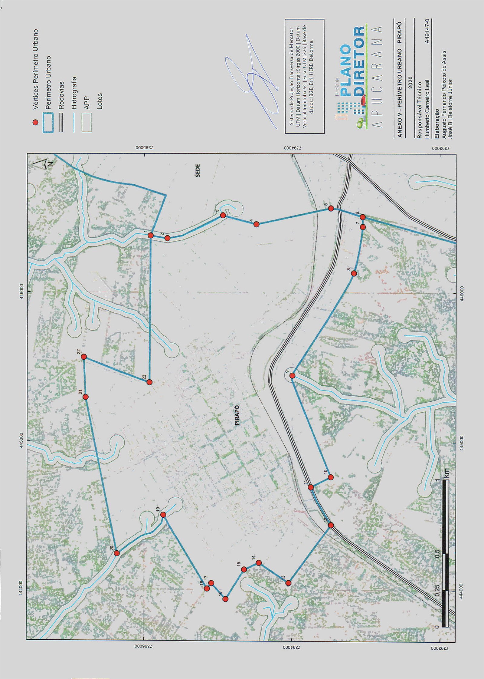 Todas as coordenadas aqui descritas estão georreferenciadas ao Sistema Geodésico Brasileiro e encontram-se representadas no Sistema UTM, referenciadas ao Meridiano Central 51 WGr, fuso 22S, tendo como datum o SIRGAS-2000. Todos os azimutes e distâncias, área e perímetro foram calculados no plano de projeção UTM.