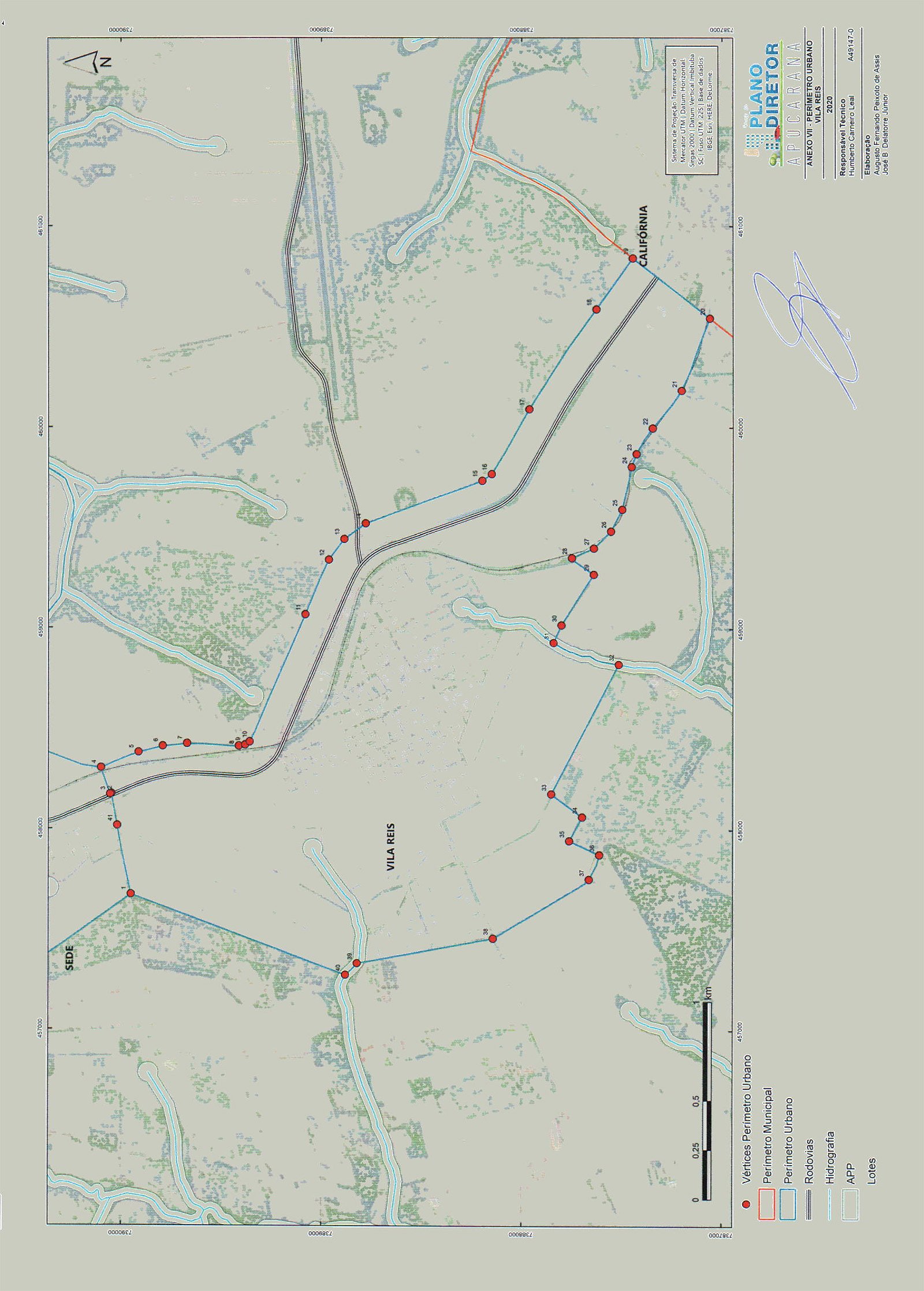 Inicia-se a descrição deste perímetro no vértice1, definido pelas coordenadas E: 457.677,218 m e N: 7.389.952,495 m com azimute 78° 57' 51,80'' e distância de 508,78 m até o vértice 2, definido pelas coordenadas E: 458.176,594 m e N: 7.390.049,886 m com azimute 338° 47' 26,37'' e distância de 6,85 m até o vértice 3, definido pelas coordenadas E: 458.174,117 m e N: 7.390.056,269 m com azimute 70° 56' 30,03'' e distância de 139,81 m até o vértice 4, definido pelas coordenadas E: 458.306,260 m e N: 7.390.101,920 m com azimute 157° 31' 17,88'' e distância de 201,96 m até o vértice 5, definido pelas coordenadas E: 458.383,478 m e N: 7.389.915,300 m com azimute 165° 48' 56,91'' e distância de 124,64 m até o vértice 6, definido pelas coordenadas E: 458.414,020 m e N: 7.389.794,459 m com azimute 173° 58' 54,70'' e distância de 122,16 m até o vértice 7, definido pelas coordenadas E: 458.426,828 m e N: 7.389.672,969 m com azimute 182° 39' 40,81'' e distância de 259,17 m até o vértice 8, definido pelas coordenadas E: 458.414,794 m e N: 7.389.414,076 m com azimute 169° 34' 22,95'' e distância de 31,73 m até o vértice 9, definido pelas coordenadas E: 458.420,536 m e N: 7.389.382,873 m com azimute 145° 39' 56,13'' e distância de 27,25 m até o vértice 10, definido pelas coordenadas E: 458.435,907 m e N: 7.389.360,369 m com azimute 113° 40' 32,66'' e distância de 689,10 m até o vértice 11, definido pelas coordenadas E: 459.067,005 m e N: 7.389.083,655 m com azimute 113° 19' 34,80'' e distância de 297,89 m até o vértice 12, definido pelas coordenadas E: 459.340,545 m e N: 7.388.965,701 m com azimute 126° 25' 19,55'' e distância de 128,90 m até o vértice 13, definido pelas coordenadas E: 459.444,264 m e N: 7.388.889,171 m com azimute 144° 09' 11,73'' e distância de 131,46 m até o vértice 14, definido pelas coordenadas E: 459.521,249 m e N: 7.388.782,612 m com azimute 159° 49' 26,03'' e distância de 621,67 m até o vértice 15, definido pelas coordenadas E: 459.735,667 meN: 7.388.199,090 m com azimute 145° 35' 20,56'' e distância de 57,65 m até o vértice 16, definido pelas coordenadas E: 459.768,244 m e N: 7.388.151,532 m com azimute 120° 09' 39,19'' e distância de 372,88 m até o vértice 17, definido pelas coordenadas E: 460.090,641 m e N: 7.387.964,187 m com azimute 124° 03' 18,58'' e distância de 599,92 m até o vértice 18, definido pelas coordenadas E: 460.587,676 m e N: 7.387.628,236 m com azimute 125° 46' 28,24'' e distância de 312,23 m até o vértice 19, definido pelas coordenadas E: 460.840,992 m e N: 7.387.445,710 m com azimute 217° 46' 59,29'' e distância de 485,67 m até o vértice 20, definido pelas coordenadas E: 460.543,433 m e N: 7.387.061,866 m com azimute 291° 29' 23,29'' e distância de 385,39 m até o vértice 21, definido pelas coordenadas E: 460.184,837 m e N: 7.387.203,047 m com azimute 307° 36' 27,65'' e distância de 236,29 m até o vértice 22, definido pelas coordenadas E: 459.997,644 m e N: 7.387.347,245 m com azimute 302° 09' 51,12'' e distância de 151,59 m até o vértice 23, definido pelas coordenadas E: 459.869,320 m e N: 7.387.427,943 m com azimute 290° 41' 02,72'' e distância de 69,29 m até o vértice 24, definido pelas coordenadas E: 459.804,497 m e N: 7.387.452,417 m com azimute 282° 47' 02,24'' e distância de 215,83 m até o vértice 25, definido pelas coordenadas E: 459.594,021 m e N: 7.387.500,174 m com azimute 296° 53' 46,82'' e distância de 122,82 m até o vértice 26, definido pelas coordenadas E: 459.484,483 m e N: 7.387.555,737 m com azimute 315° 32' 08,27'' e distância de 120,12 m até o vértice 27, definido pelas coordenadas E: 459.400,346 m e N: 7.387.641,462 m com azimute 336° 30' 03,92'' e distância de 119,44 m até o vértice 28, definido pelas coordenadas E: 459.352,720 m e N: 7.387.751,000 m com azimute 217° 00' 25,61'' e distância de 136,29 m até o vértice 29, definido pelas coordenadas E: 459.270,685 m e N: 7.387.642,164 m com azimute 302° 17' 35,74'' e distância de 300,17 m até o vértice30, definido pelas coordenadas E: 459.016,945 m e N: 7.387.802,530 m com azimute 294° 20' 44,95'' e distância de 95,67 m até o vértice 31, definido pelas coordenadas E: 458.929,781 m e N: 7.387.841,970 m e segue o leito do Córrego Tu elo até o vértice 32, definido pelas coordenadas E: 458.821,781 m e N: 7.387.516,970 m com azimute 297° 36' 22,90'' e distância de 726,49 m até o vértice 33, definido pelas coordenadas E: 458.178,003 m e N: 7.387.853,620 m com azimute 216° 32' 21,04'' e distância de 192,93 m até o vértice 34, definido pelas coordenadas E: 458.063,139 m e N: 7.387.698,612 m com azimute 298° 35' 22,69'' e distância de 134,83 m até o vértice 35, definido pelas coordenadas E: 457.944,750 m e N: 7.387.763,132 m com azimute 204° 38' 49,58'' e distância de 165,31 m até o vértice 36, definido pelas coordenadas E: 457.875,813 m e N: 7.387.612,887 m com azimute 293° 01' 03,43'' e distância de 131,95 m até o vértice 37, definido pelas coordenadas E: 457.754,369 m e N: 7.387.664,481 m com azimute 328° 30' 32,73'' e distância de 562,23 m até o vértice 38, definido pelas coordenadas E: 457.460,681 m e N: 7.388.143,907 m com azimute 349° 34' 08,16'' e distância de 691,47 m até o vértice 39, definido pelas coordenadas E: 457.335,488 m e N: 7.388.823,953 m com azimute 315° 09' 12,53'' e distância de 81,83 m até o vértice 40, definido pelas coordenadas E: 457.277,780 m e N: 7.388.881,971 m com azimute 33° 00' 19,57'' e distância de 1.358,02 m até o vértice 41, definido pelas coordenadas E: 458.017,518 m e N: 7.390.020,831 m com azimute 258° 38' 43,41'' e distância de 347,09 m até o vértice 1, encerrando este perímetro.