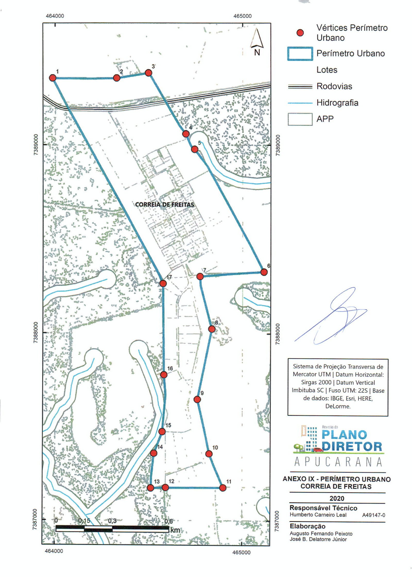 Inicia-se a descrição deste perímetro no vértice (Ponto de Partida) 1, definido pelas coordenadas E: 457.677,218 m e N: 7.389.952,495 m com azimute 78° 57' 51,80'' e distância de 508,78 m até o vértice 2, definido pelas coordenadas E: 458.176,594 m e N: 7.390.049,886 m com azimute 338° 47' 26,37'' e distância de 6,85 m até o vértice 3, definido pelas coordenadas E: 458.174,117 m e N: 7.390.056,269 m com azimute 70° 56' 30,03'' e distância de 139,81 m até o vértice 4, definido pelas coordenadas E: 458.306,260 m e N: 7.390.101,920 m com azimute 157° 31' 17,88'' e distância de 201,96 m até o vértice 5, definido pelas coordenadas E: 458.383,478 m e N: 7.389.915,300 m com azimute 165° 48' 56,91'' e distância de 124,64 m até o vértice 6, definido pelas coordenadas E: 458.414,020 m e N: 7.389.794,459 m com azimute 173° 58' 54,70'' e distância de 122,16 m até o vértice 7, definido pelas coordenadas E: 458.426,828 m e N: 7.389.672,969 m com azimute 182° 39' 40,81'' e distância de 259,17 m até o vértice 8, definido pelas coordenadas E: 458.414,794 m e N: 7.389.414,076 m com azimute 169° 34' 22,95'' e distância de 31,73 m até o vértice 9, definido pelas coordenadas E: 458.420,536 m e N: 7.389.382,873 m com azimute 145° 39' 56,13'' e distância de 27,25 m até o vértice 10, definido pelas coordenadas E: 458.435,907 m e N: 7.389.360,369 m com azimute 113° 40' 32,66'' e distância de 689,10 m até o vértice 11, definido pelas coordenadas E: 459.067,005 m e N: 7.389.083,655 m com azimute 113° 19' 34,80'' e distância de 297,89 m até o vértice 12, definido pelas coordenadas E: 459.340,545 m e N: 7.388.965,701 m com azimute 126° 25' 19,55'' e distância de 128,90 m até o vértice 13, definido pelas coordenadas E: 459.444,264 m e N: 7.388.889,171 m com azimute 144° 09' 11,73'' e distância de 131,46 m até o vértice 14, definido pelas coordenadas E: 459.521,249 m e N: 7.388.782,612 m com azimute 159° 49' 26,03'' e distância de 621,67 m até o vértice 15, definido pelas coordenadasE: 459.735,667 m e N: 7.388.199,090 m com azimute 145° 35' 20,56'' e distância de 57,65 m até o vértice 16, definido pelas coordenadas E: 459.768,244 m e N: 7.388.151,532 m com azimute 120° 09' 39,19'' e distância de 372,88 m até o vértice 17, definido pelas coordenadas E: 460.090,641 m e N: 7.387.964,187 m com azimute 309° 29' 00,73'' e distância de 3.126,98 m até o vértice 1, encerrando este perímetro.
