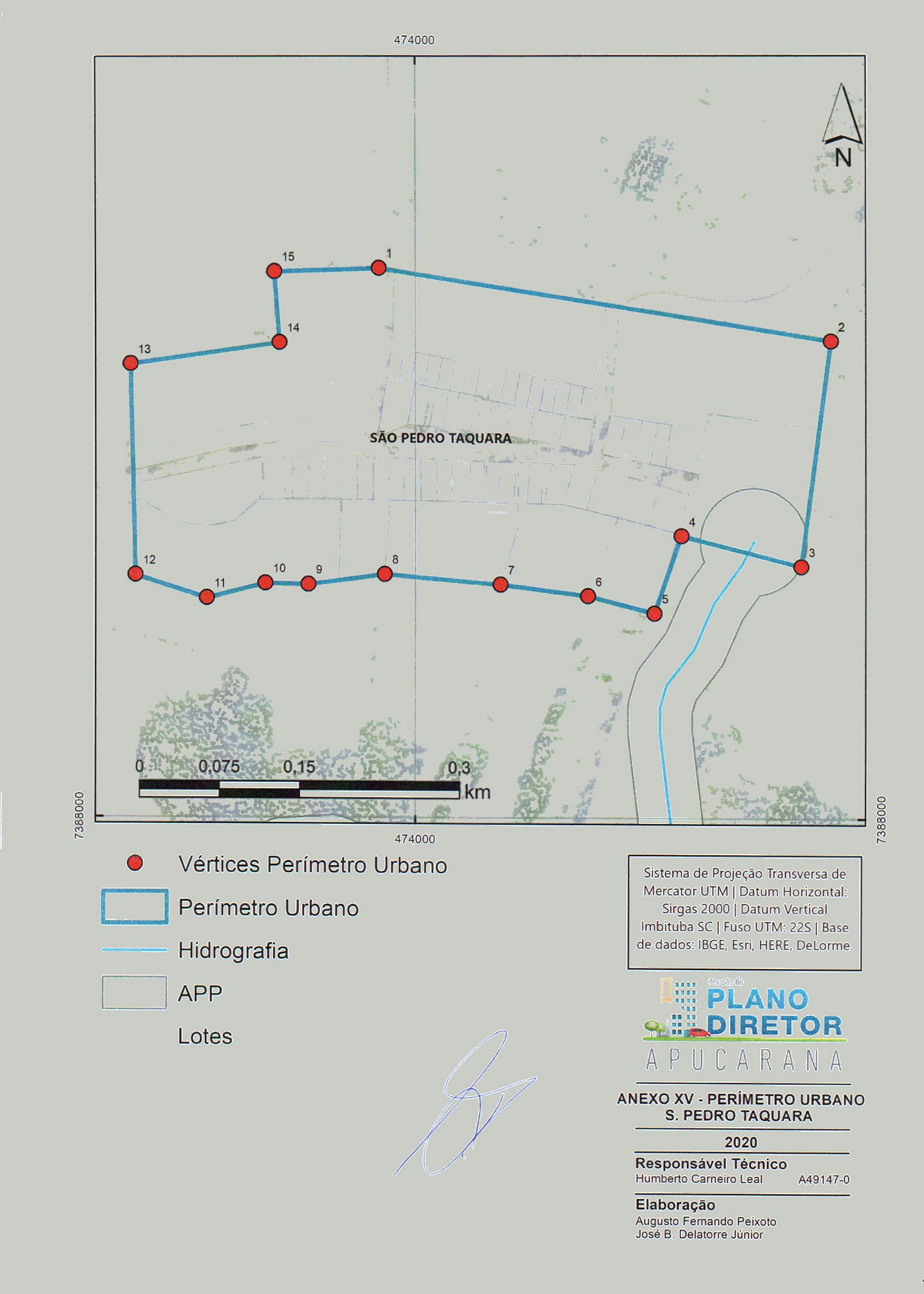 Inicia-se a descrição deste perímetro no vértice (Ponto de Partida) 1, definido pelas coordenadas E: 473.965,658 m e N: 7.388.513,232 m com azimute 99° 07' 35,80'' e distância de 429,71 m até o vértice 2, definido pelas coordenadas E: 474.389,927 m e N: 7.388.445,073 m com azimute 187° 31' 59,20'' e distância de 212,04 m até o vértice 3, definido pelas coordenadas E: 474.362,129 m e N: 7.388.234,865 m com azimute 284° 10' 08,57'' e distância de 115,94 m até o vértice 4, definido pelas coordenadas E: 474.249,717 m e N: 7.388.263,245 m com azimute 199° 16' 51,47'' e distância de 76,52 m até o vértice 5, definido pelas coordenadas E: 474.224,449 m e N: 7.388.191,014 m com azimute 284° 15' 51,98'' e distância de 64,43 m até o vértice 6, definido pelas coordenadas E: 474.162,007 m e N: 7.388.206,889 m com azimute 277° 22' 50,10'' e distância de 82,87 m até o vértice 7, definido pelas coordenadas E: 474.079,827 m e N: 7.388.217,534 m com azimute 275° 00' 20,96'' e distância de 109,16 m até o vértice 8, definido pelas coordenadas E: 473.971,083 m e N: 7.388.227,059 m com azimute 262° 25' 35,57'' e distância de 72,19 m até o vértice 9, definido pelas coordenadas E: 473.899,526 m e N: 7.388.217,545 m com azimute 271° 30' 30,14'' e distância de 40,23 m até o vértice 10, definido pelas coordenadas E: 473.859,309 m e N: 7.388.218,604 m com azimute 255° 57' 46,88'' e distância de 56,73 m até o vértice 11, definido pelas coordenadas E: 473.804,276 m e N: 7.388.204,845 m com azimute 287° 42' 00,23'' e distância de 70,07 m até o vértice 12, definido pelas coordenadas E: 473.737,522 m e N: 7.388.226,149 m com azimute 358° 41' 53,11'' e distância de 197,44 m até o vértice 13, definido pelas coordenadas E: 473.733,036 m e N: 7.388.423,539 m com azimute 81° 46' 33,95'' e distância de 140,98 m até o vértice 14, definido pelas coordenadas E: 473.872,566 m e N: 7.388.443,705 m com azimute 355° 51' 40,22'' e distância de 66,44 m até o vértice 15, definido pelas coordenadas E: 473.867,771 m e N: 7.388.509,969 m com azimute 88° 05' 26,84'' e distância de 97,94 m até o vértice 1, encerrando este perímetro.